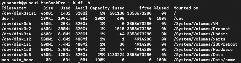 [ 파일 시스템 목록, 디스크 크기, 사용량, 여유공간, 사용률, 마운트지점 ]순
