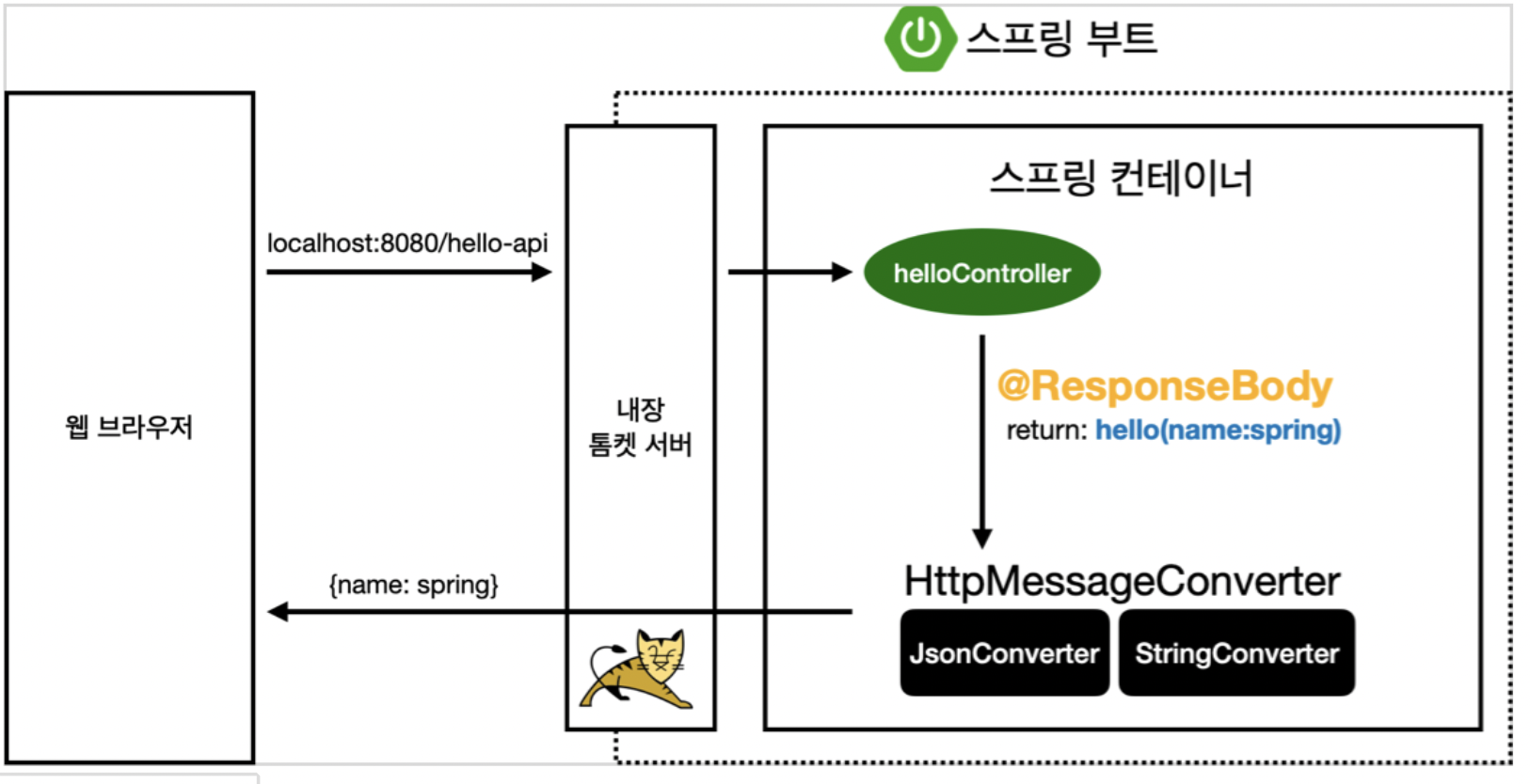 - 톰캣 내장 서버에서 스프링에게 hello-api가 왔다고 던진다.