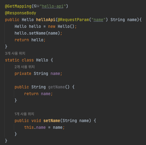3. HelloController.java에서 helloApi 메소드를 작성한다.