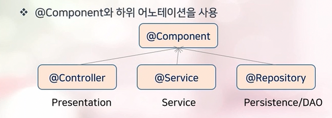 스프링에서는 컴포넌트 어노테이션을 상속한 세개의 어노테이션을 주로 사용.