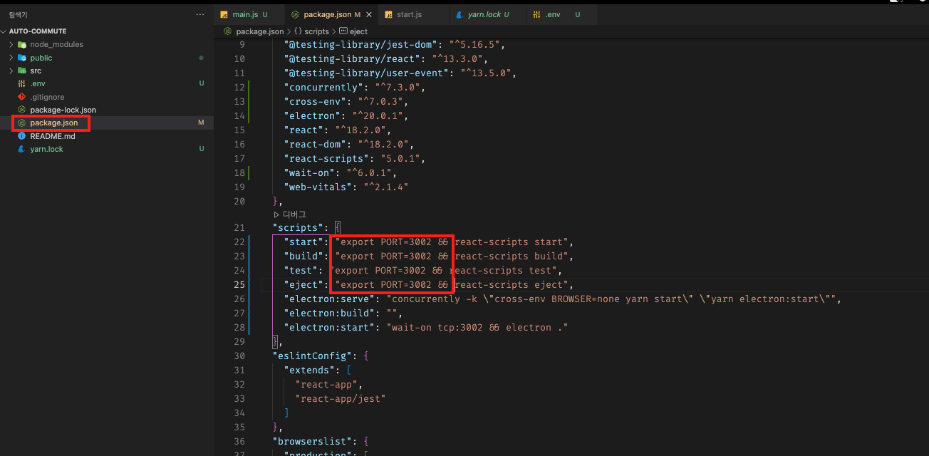 참고 사이트에서는 start에만 했는데, 나는 build도 할꺼라서 그냥 전부 다했다. 참고로 scripts에 electron필드들은 무시하도록(별도로 진행중인 프로젝트 때문에 넣은 것임).