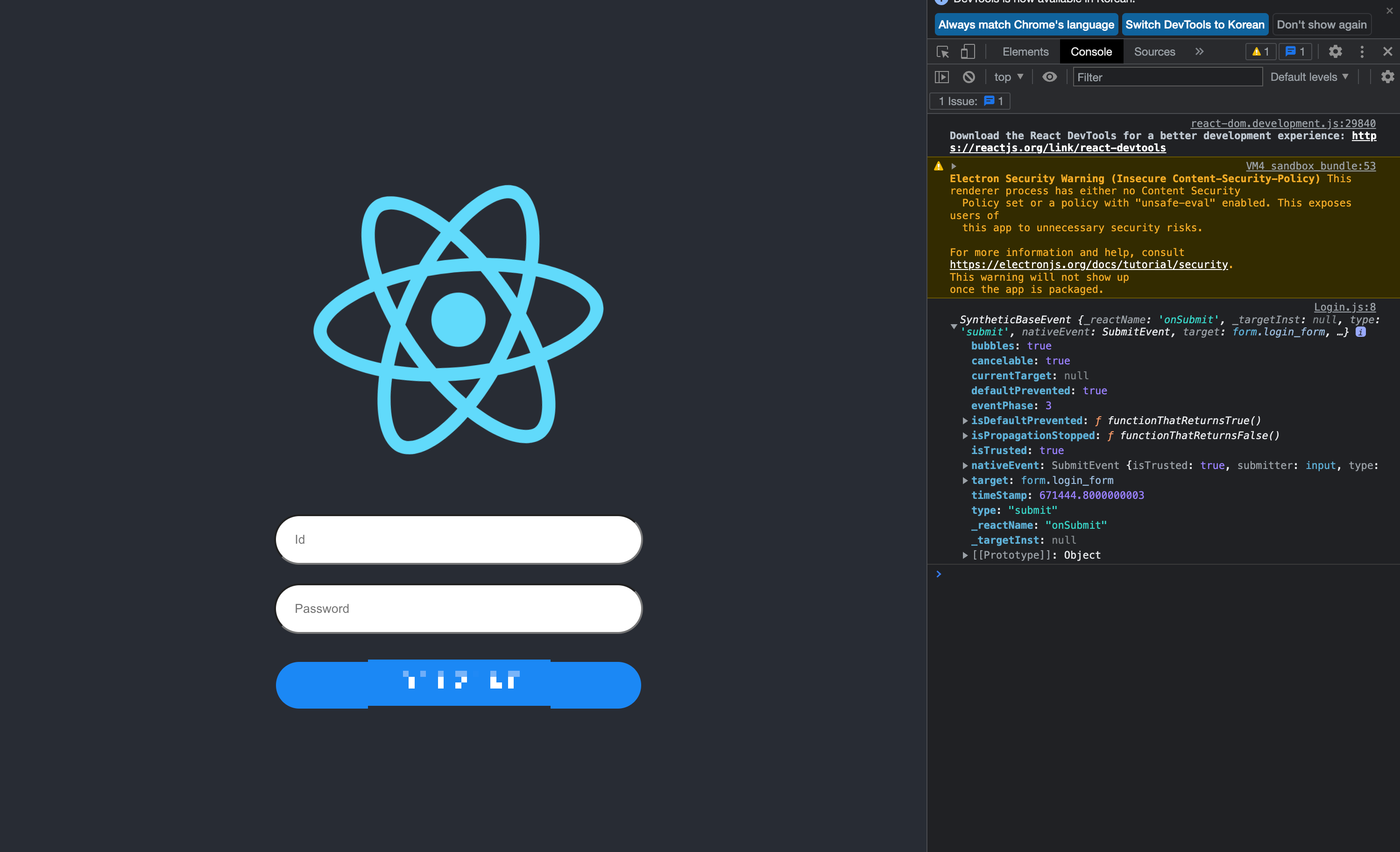 electron으로 프로젝트를 생성하여 console.log를 찍었을땐, 터미널창에 잘 보였지만
