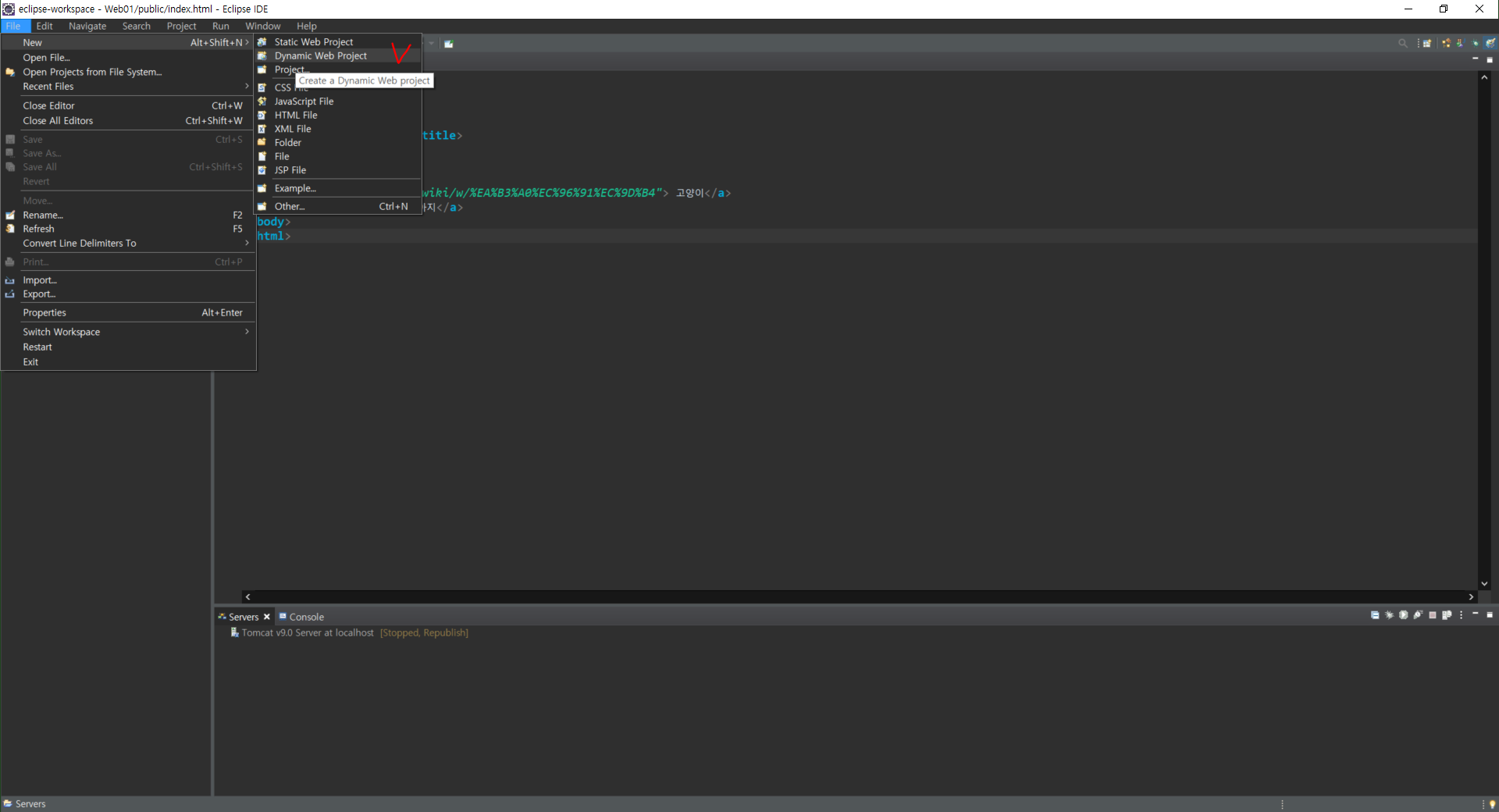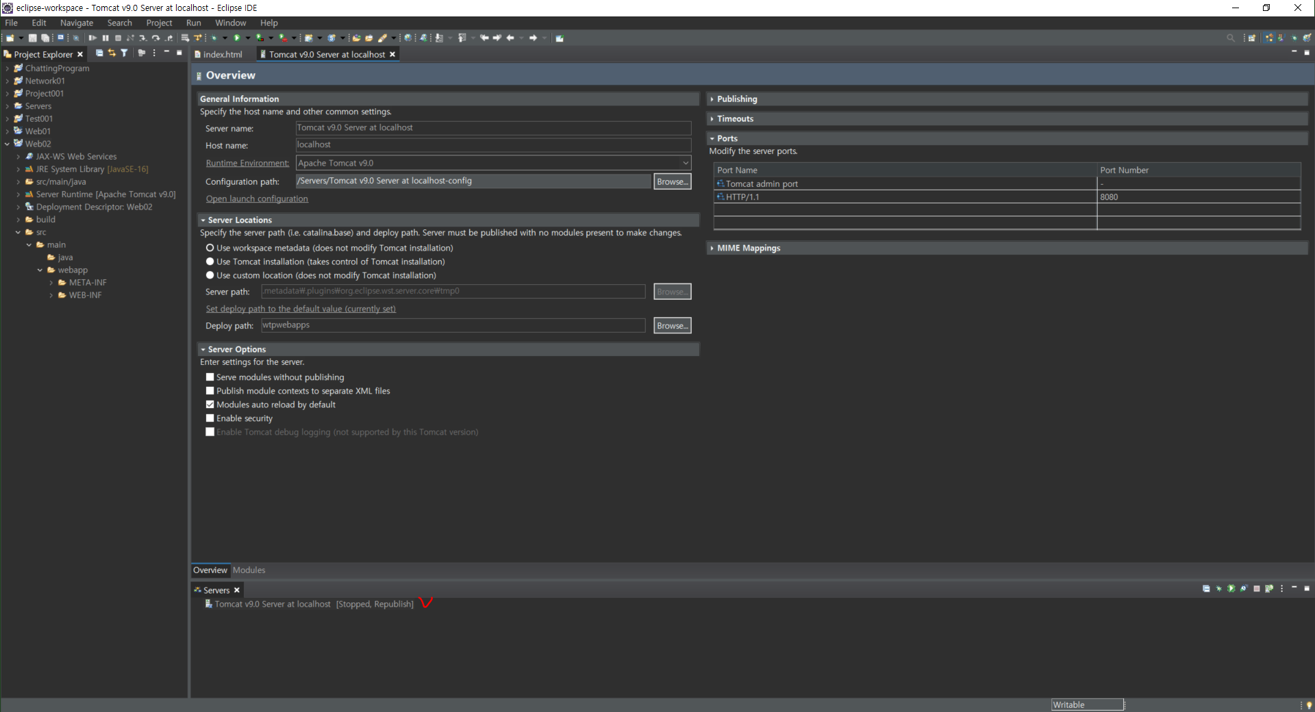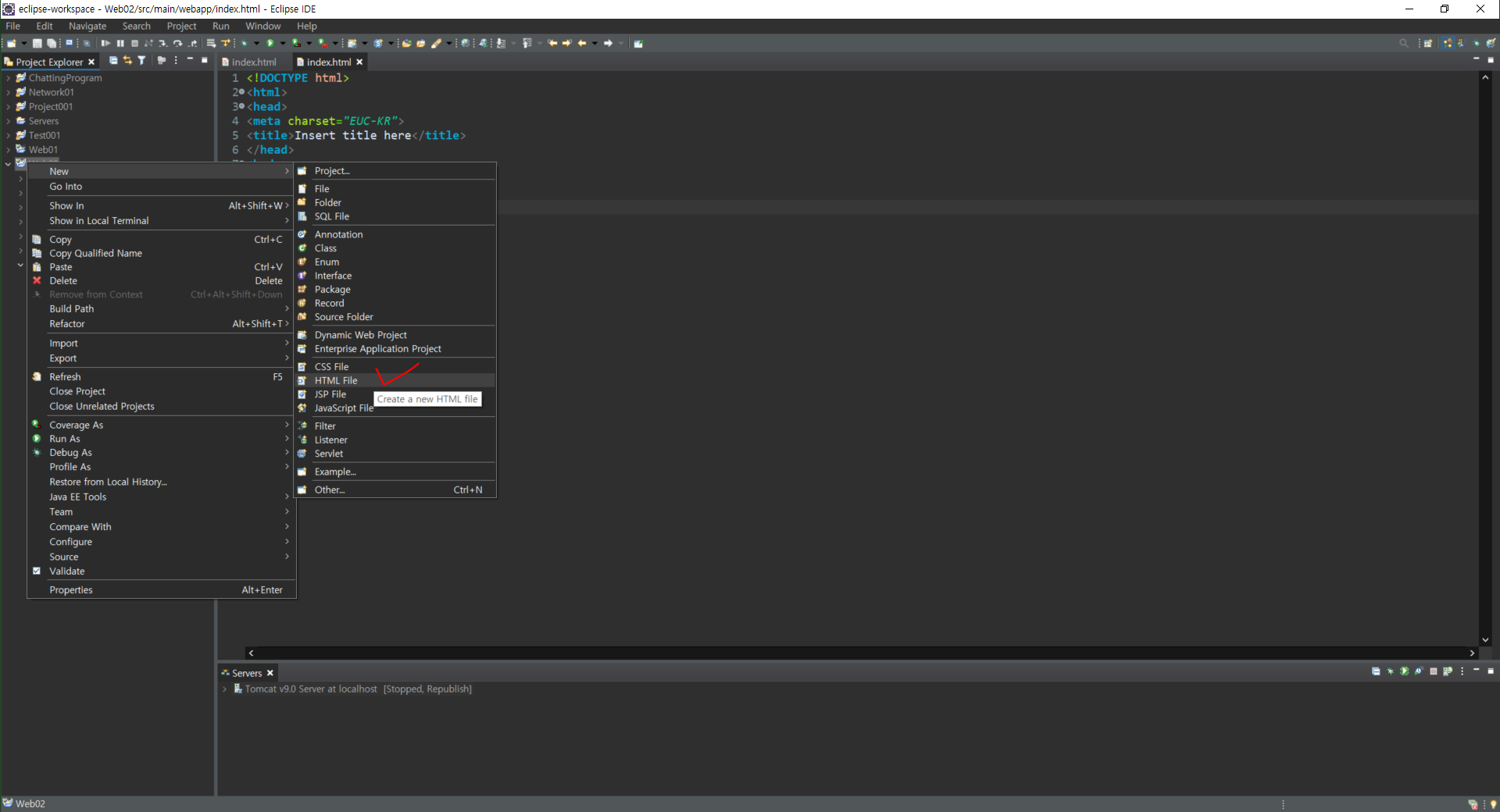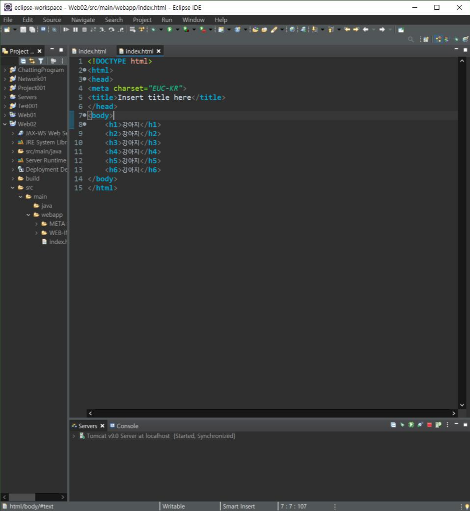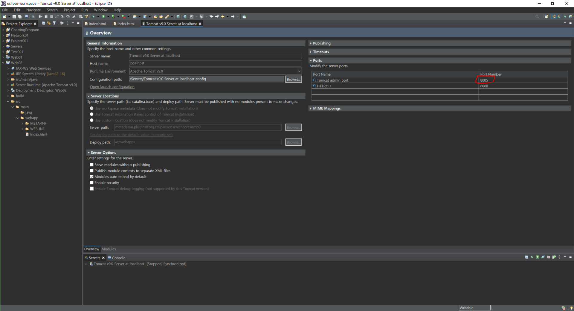 톰캣을 사용할때, 자주 쓰이는 경로이므로 왼쪽 경로를 잘 보길 바람!Overview에 Tomcat v9.0 Server at localhost [Stopped, Republish] 를 두번 클릭한다.Port Name에 Tomcat admin port의 Port Number을 8005로 적어준다. (톰캣의 포트 번호가 8005이기 때문에)8005로 작성하였으면, 빈 곳 아무것이나 누른다음, x를 누르면 저장 팝업이 뜬다. sava를 클릭한다.프로젝트에서 우클릭하여 Properties를 클릭한다. Project Facets을 클릭 후, Runtimes을 클릭한다.Apache Tomcat v9.0이 체크가 되어있지 않다면, 체크를 하고 Apply 와 Apply and Close 버튼을 순서대로 클릭한다. (체크가 되어있더라도 Apply 버튼을 누른다. 이 과정은 프로젝트를 만들때마다 항상 해주도록 한다.)프로젝트에서 우클릭 후, New > HTML File을 누른다. FIle name을 index로 작성한 후, Finish를 클릭한다.body 부분안에 <h1~6> 태그로 글자를 집어넣는다.상단에 초록색 재생버튼 옆에 아래쪽으로 향해있는 세모를 클릭한 뒤, Run As > Run on Server를 클릭한다.다음과 같은 출력 결과를 확인할 수 있다.