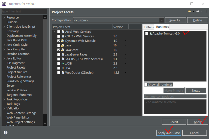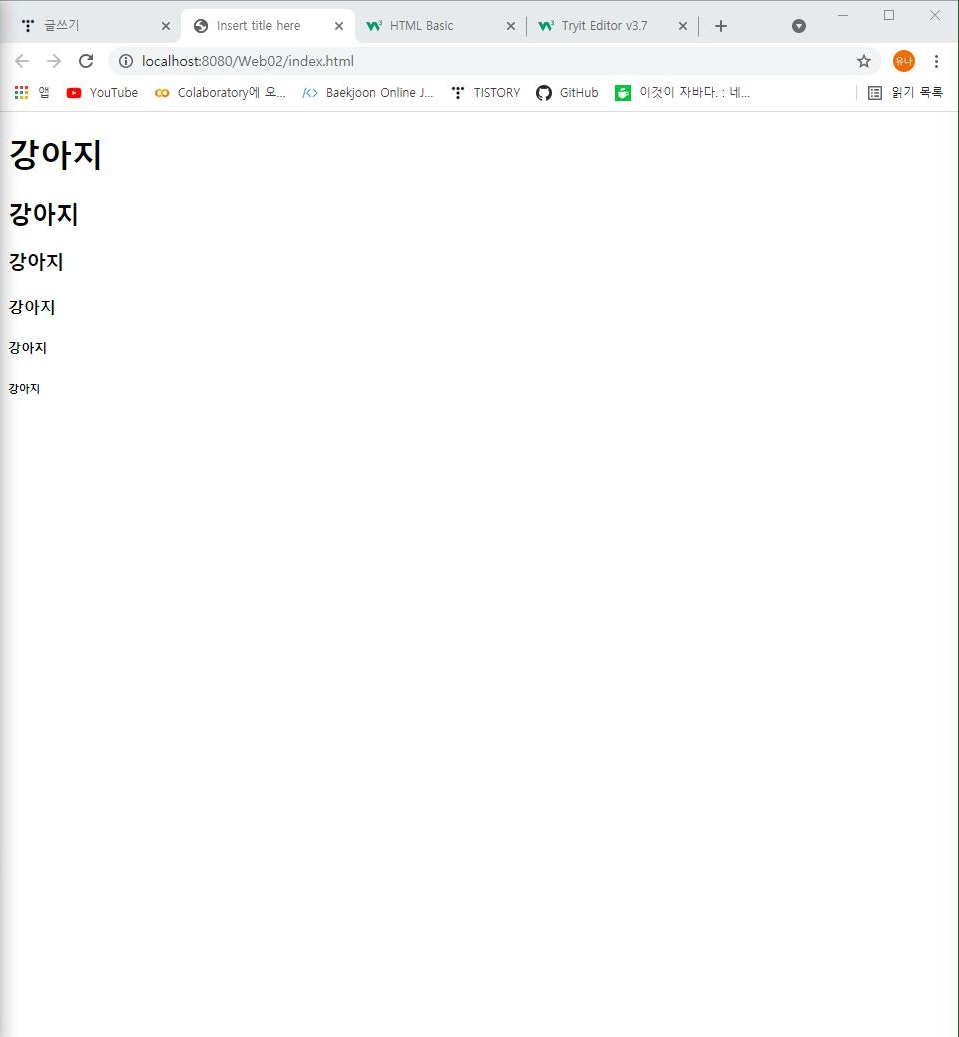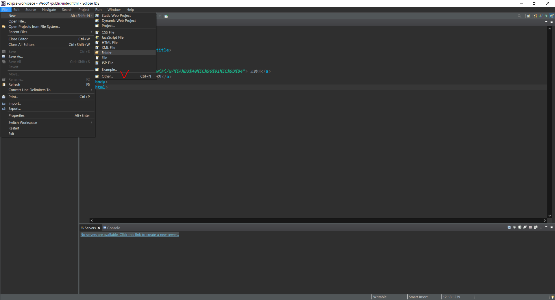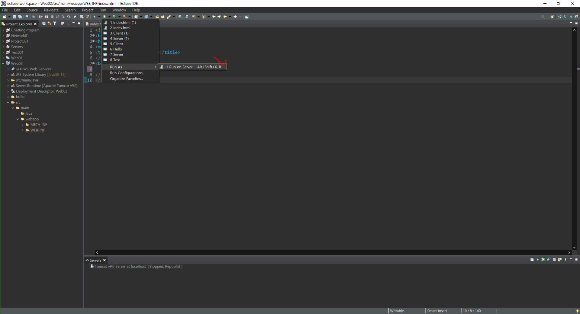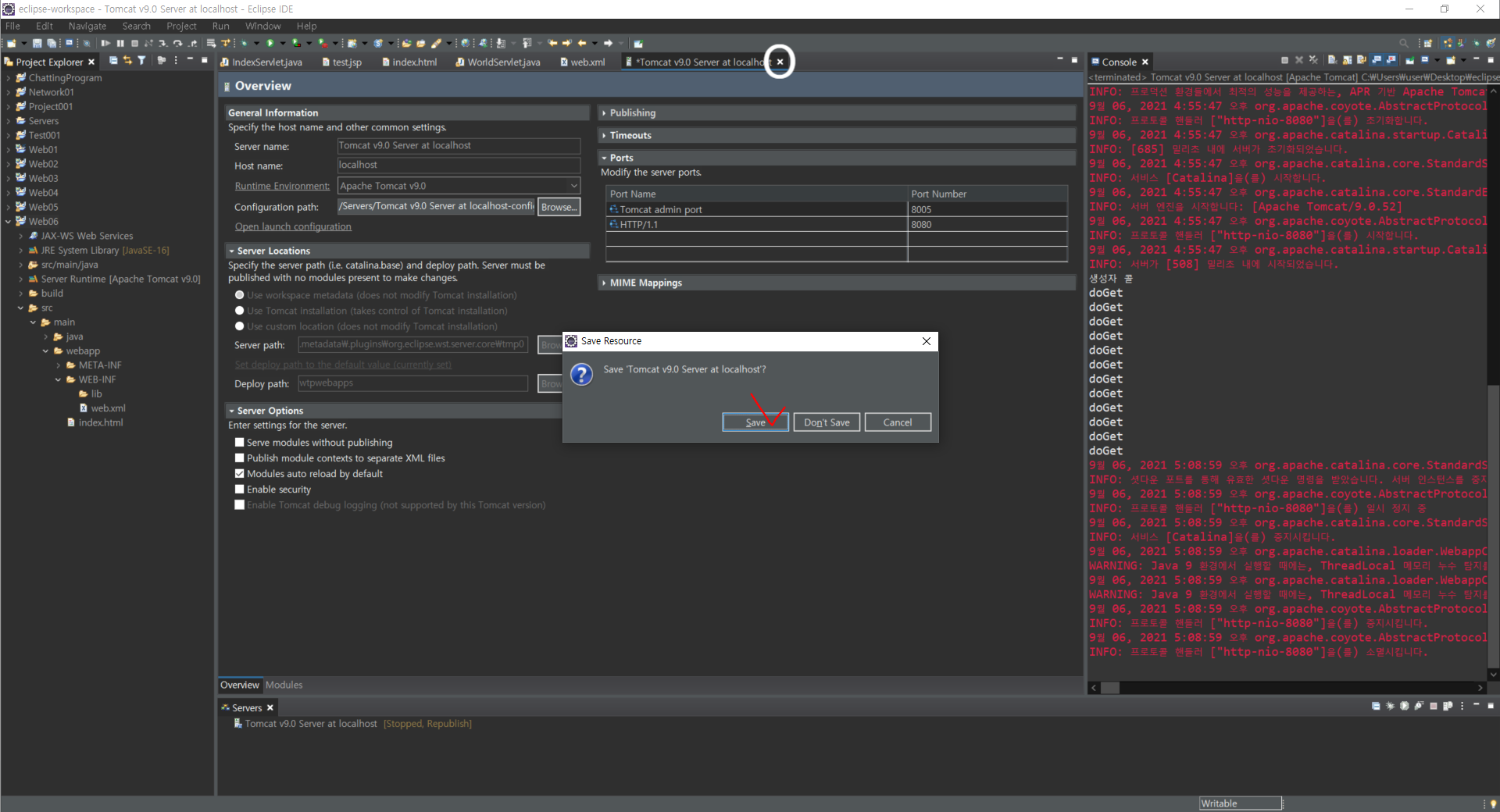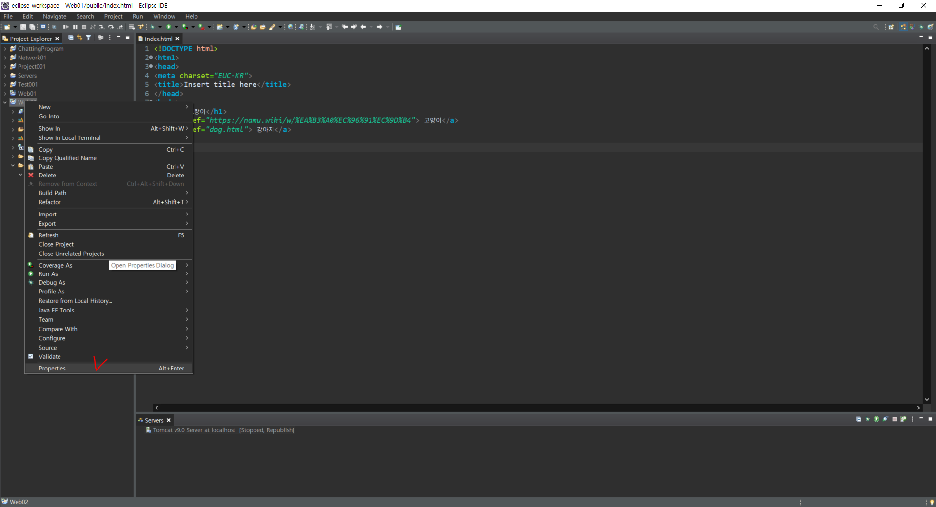 톰캣을 사용할때, 자주 쓰이는 경로이므로 왼쪽 경로를 잘 보길 바람!Overview에 Tomcat v9.0 Server at localhost [Stopped, Republish] 를 두번 클릭한다.Port Name에 Tomcat admin port의 Port Number을 8005로 적어준다. (톰캣의 포트 번호가 8005이기 때문에)8005로 작성하였으면, 빈 곳 아무것이나 누른다음, x를 누르면 저장 팝업이 뜬다. sava를 클릭한다.프로젝트에서 우클릭하여 Properties를 클릭한다. Project Facets을 클릭 후, Runtimes을 클릭한다.Apache Tomcat v9.0이 체크가 되어있지 않다면, 체크를 하고 Apply 와 Apply and Close 버튼을 순서대로 클릭한다. (체크가 되어있더라도 Apply 버튼을 누른다. 이 과정은 프로젝트를 만들때마다 항상 해주도록 한다.)프로젝트에서 우클릭 후, New > HTML File을 누른다. FIle name을 index로 작성한 후, Finish를 클릭한다.body 부분안에 <h1~6> 태그로 글자를 집어넣는다.상단에 초록색 재생버튼 옆에 아래쪽으로 향해있는 세모를 클릭한 뒤, Run As > Run on Server를 클릭한다.다음과 같은 출력 결과를 확인할 수 있다.
