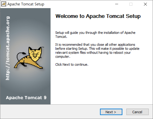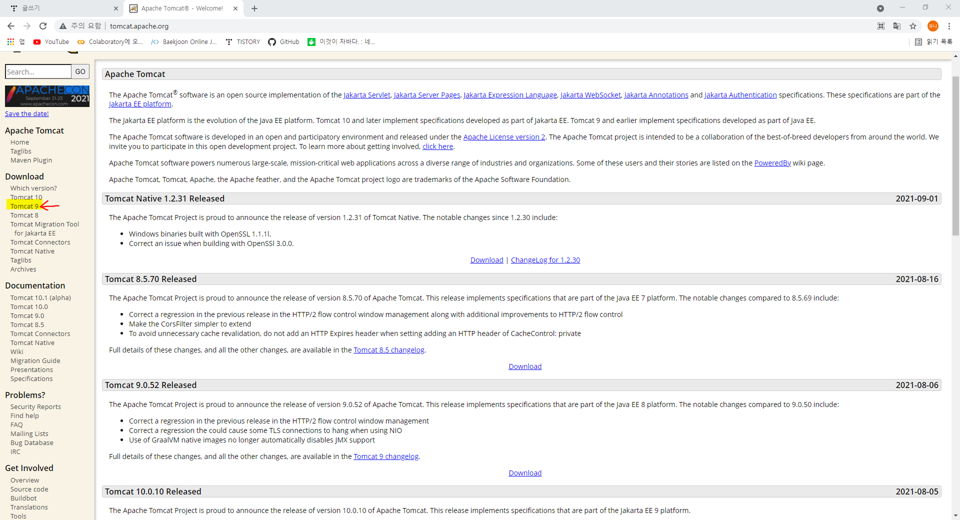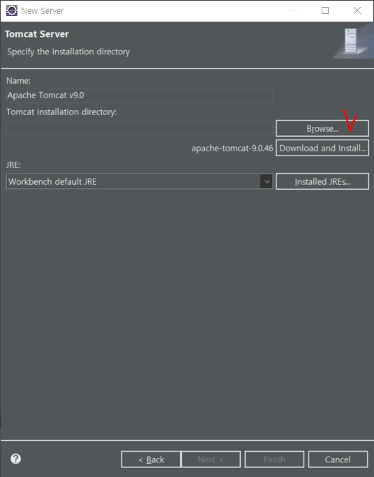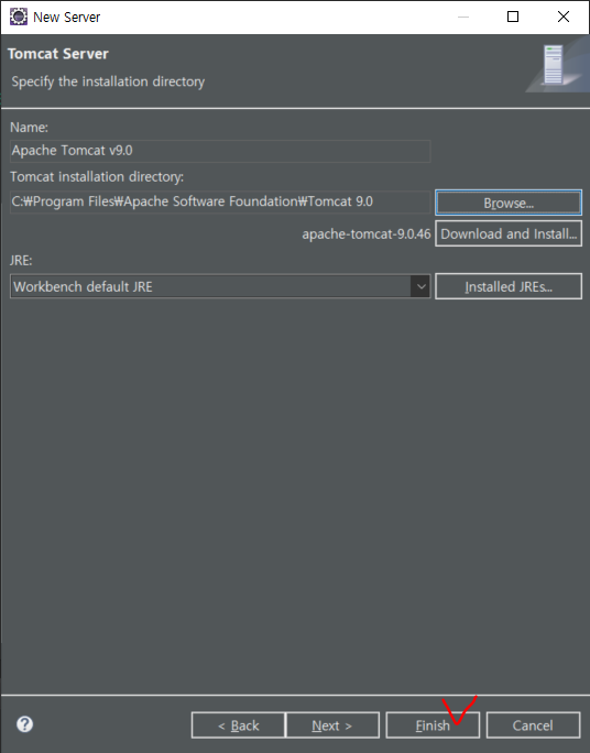 톰캣 사이트로 들어가 왼쪽 메뉴에 Download의 Tomcat 9를 클릭한다. (이클립스에서 사용할 예정이며, 톰캣9가 안정화되어 있기 때문에 9를 쓰는 걸로)32-bit/64-bit Windows Service installer (pgp. sha512) 를 클릭하여 다운받는다.다운받은 exe 파일은 다음과 같으며, 변경 없이 계속 Next를 누른다.마지막 FInish 버튼에서 체크되어있던 것들을 해제한 후, Finish 클릭한다.톰캣 저장 위치는 C:\Program Files에 Apache Software Foundation이다.이클립스를 실행시키며, 위에 좌측 상단에 FIle > New > Other... 을 클릭한다.Server 폴더의 Server를 클릭한 뒤, Next를 누른다.Apache 폴더에 Tomcat v9.0 Server를 클릭한 후, Next 버튼을 누른다.Browse 버튼 클릭 후,C:\Program Files\Apache Software Foundation\Tomcat 9.0 경로로 들어가 폴더 선택을 클릭한다.Finish 버튼을 클릭한다.이클립스 왼쪽 Project Explorer에 Servers 폴더가 생긴 것을 확인할 수 있다. (이 서버가 톰캣이 사용할 서버)