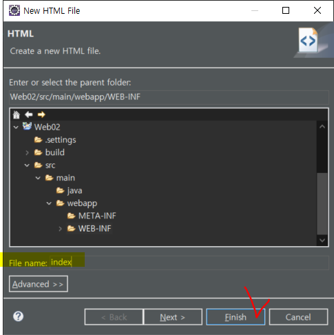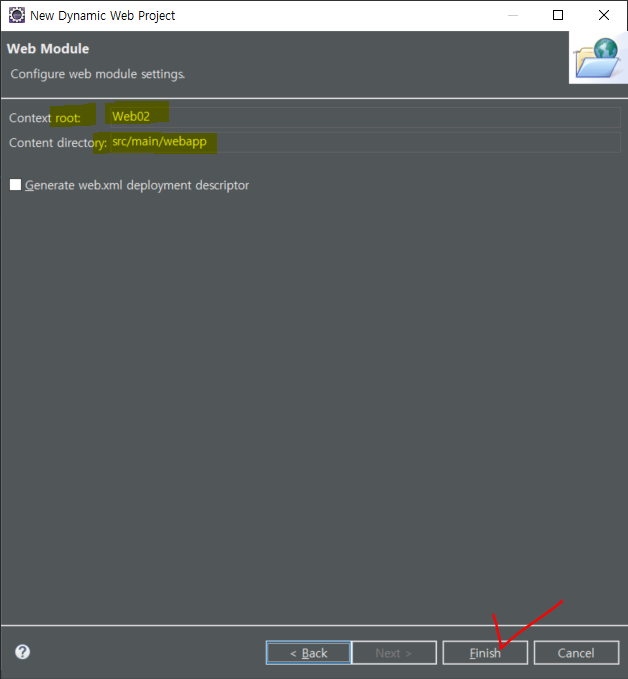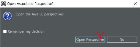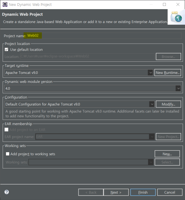이클립스 위에 좌측에 File > New > Dynamic Web Project를 클릭한다.Project name에 Web02를 작성한다. (구경을 위해 Next를 클릭)root 경로에 Web02가 있으며, 디렉토리는 index.html을 찾을 기본 경로로 생각하면 된다. 인터넷에 webcontent로 되어있는 경우가 있는데 이는 과거 버전이므로 아무거나해도 상관이 없다. (나는 webapp로 기본에 설정된 상태로 함) FInish 버튼 클릭Open Perspective 클릭