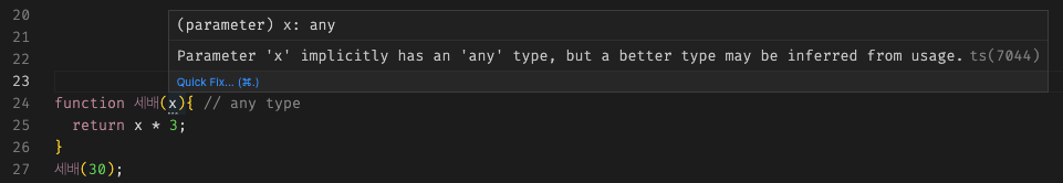 타입 미지정 시, any type이 할당된 것을 확인할 수 있다.마찬가지로 parameter에도 타입을 지정하지 않아, any type인 것을 확인할 수 있다.