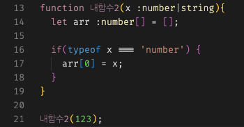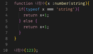 ※ typeof는 string을 반환하기 때문에 if(typeof x === number) 가 아닌 if(typeof x === 'number')로 써야한다.