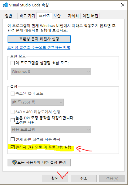 2. 호환성 메뉴에서 관리자 권한으로 이 프로그램 실행 체크 후 확인