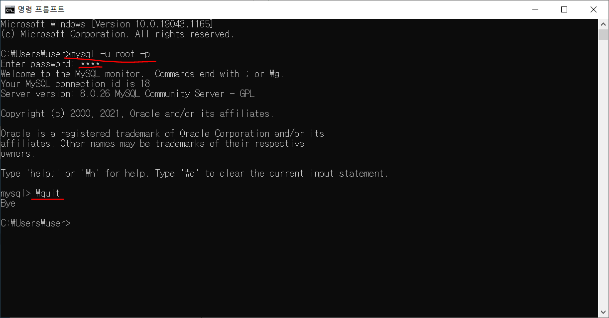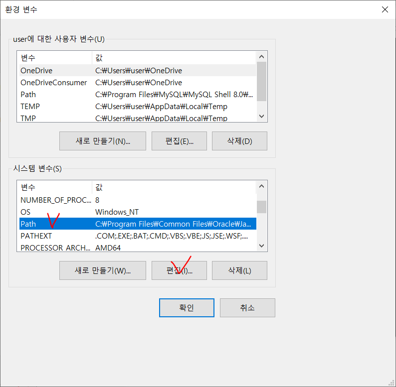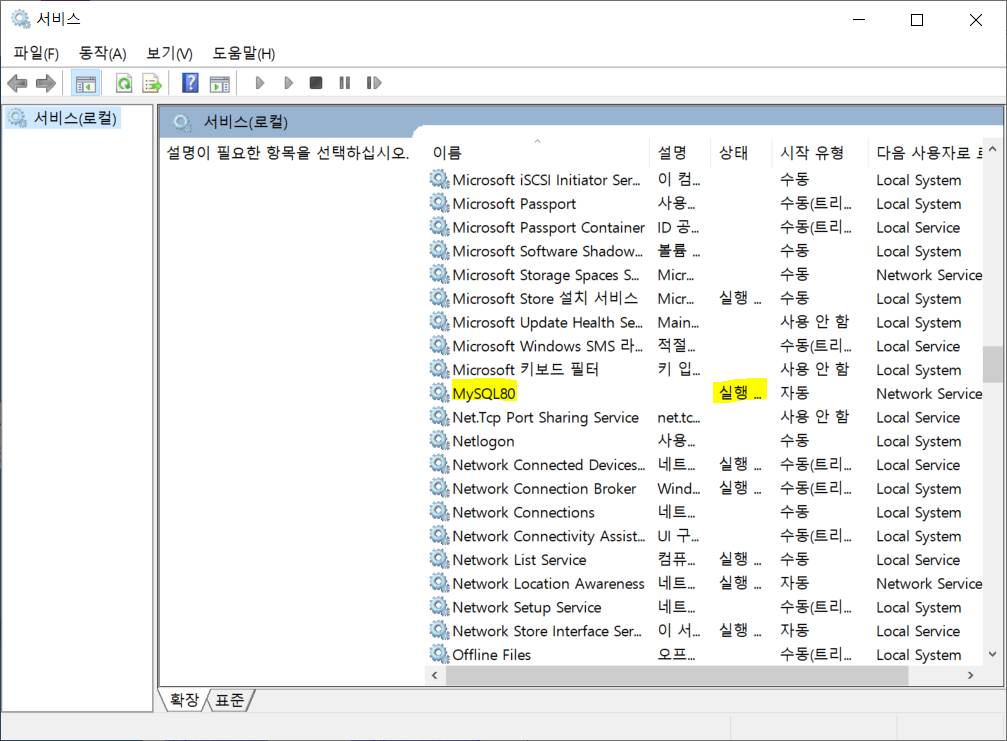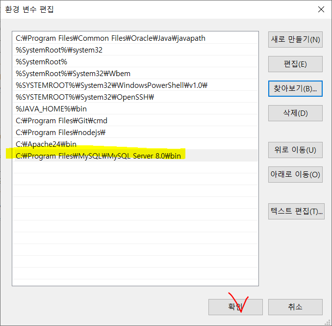 윈도우 검색창에 시스템 환경 변수 편집Path 클릭 후, 편집 클릭새로 만들기 클릭 후, 찾아보기 클릭연달아 확인 클릭cmd 창을 열어서 mysql -u root -p를 적고 엔터를 치면, 비번을 입력하라는 창이 나온다. 아까 입력한 비번(나는 1234)을 적고 엔터를 친다. sql 이 잘 작동한다는 문구를 확인하고, \quit로 종료시킨다.윈도우 검색창에 서비스를 치면, 서비스 창을 확인할 수 있는데 여기에 MySQL이 실행 중인걸 확인할 수 있다. 이건 우리가 컴퓨터를 다시 끄고 켜서 실행하더라도 계속 스레드가 돌고 있기 때문에 사용을 하지 않을떄는 수동으로 꺼버리는 것이 좋다. (컴퓨터가 느려지는 것을 방지)다음과 같이 sql을 사용하면 된다.