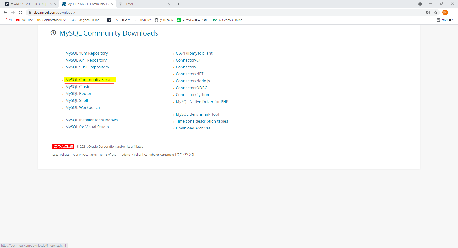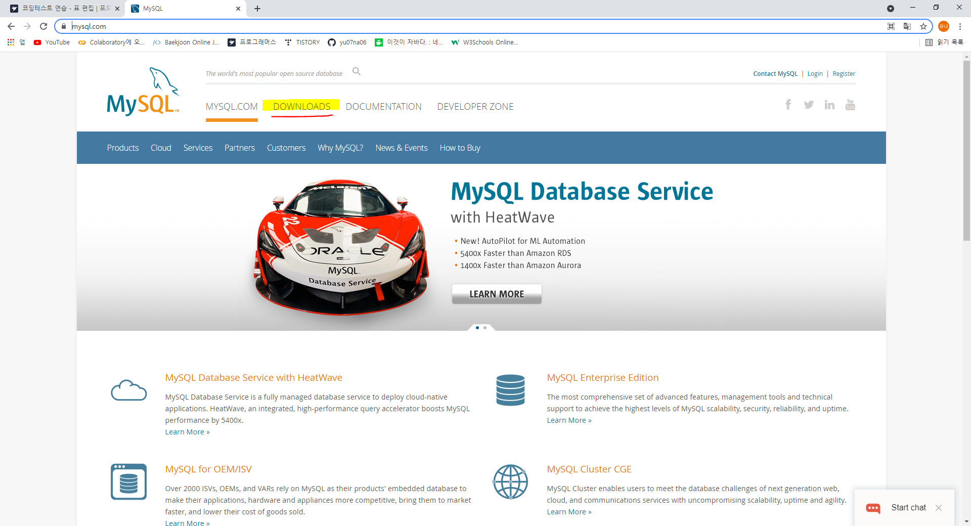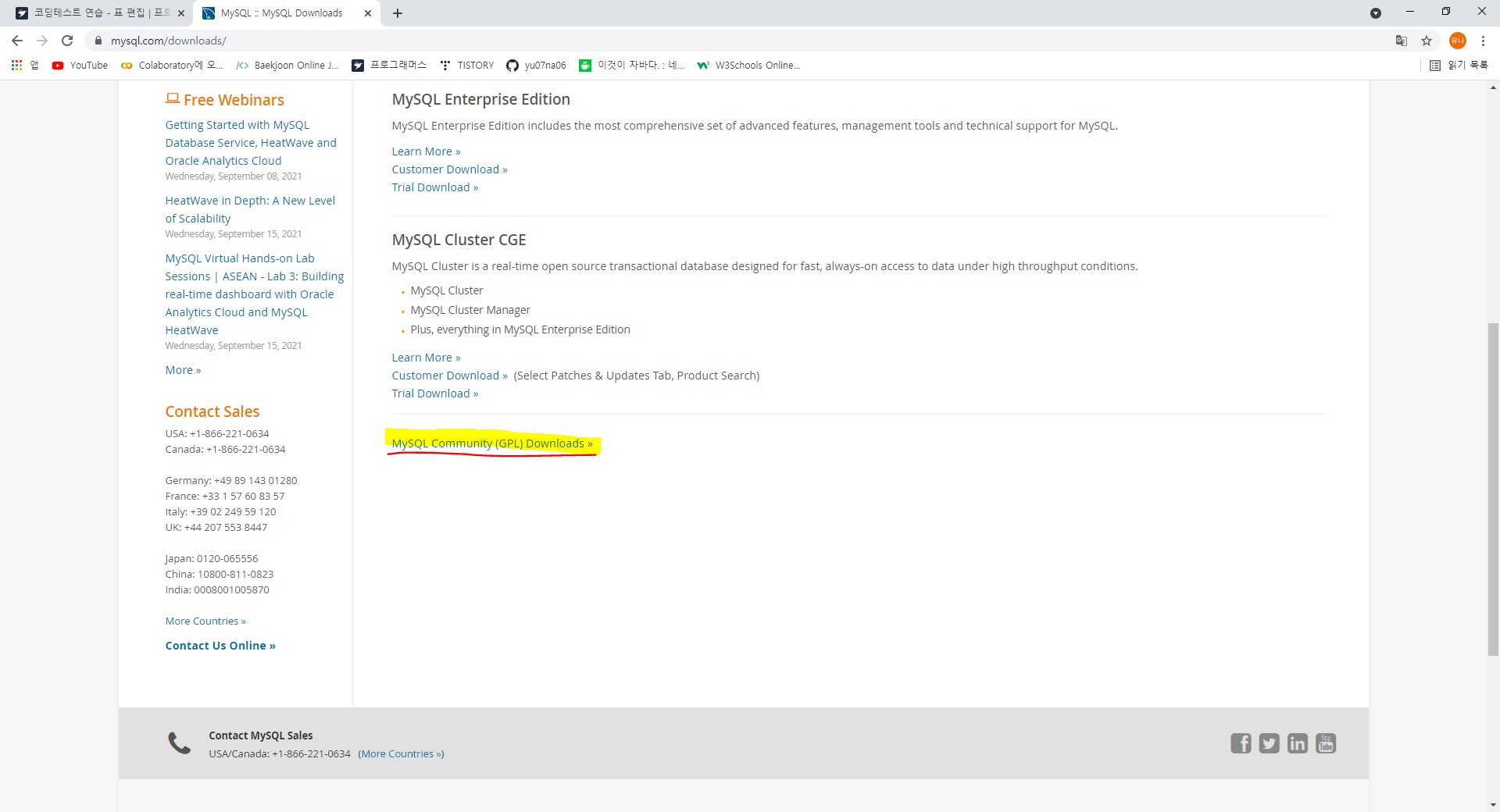 홈페이지에서 DOWNLOADS를 클릭한다.밑으로 내려와 MySQL Community (GPL) Downloads 를 클릭한다.MySQL Community Server 를 클릭한다.그림 아래에 Go to Download Page를 클릭한다.두번째 Download를 클릭한다.No thanks, just start my download를 클릭한다.Next 클릭(변경없이)Next 클릭(변경없이)팝업창이 뜨면, Yes 클릭Execute 클릭Next 클릭Next 클릭포트 번호만 눈도장찍고, Next 클릭Next 클릭(비번 까먹으면, DB 못씀..나는 비번 1234로) 비번 설정 후, Next 클릭 Next 클릭Execute 클릭Finish 클릭Next 클릭Finish 클릭Next 클릭비번 적고 Check 클릭하면, 초록색 창이 뜬다. 그런다음 Next 클릭Finish 클릭뜨는 창을 X 버튼을 누르고, 캡쳐하지 못했지만 콘솔창에는 \quit를 적고 엔터를 쳐서 콘솔창을 끈다.