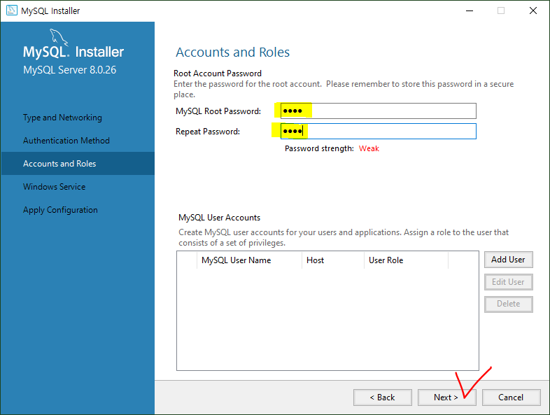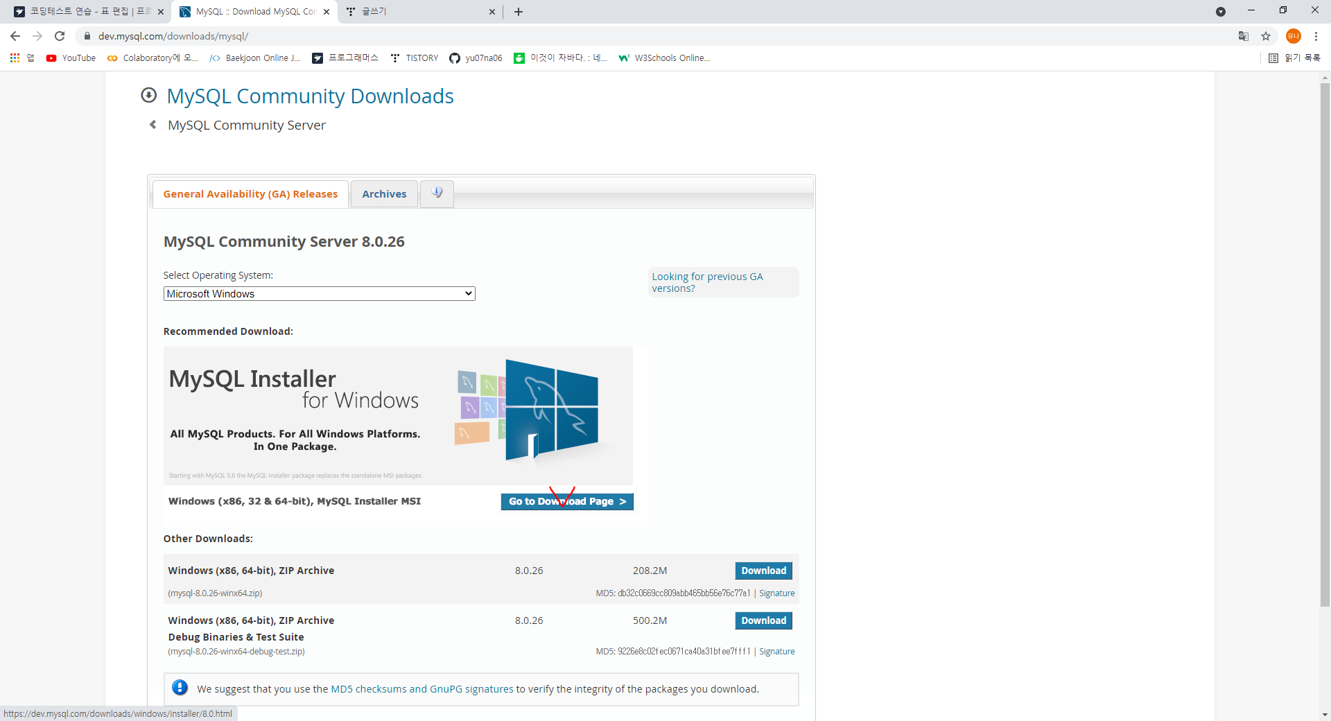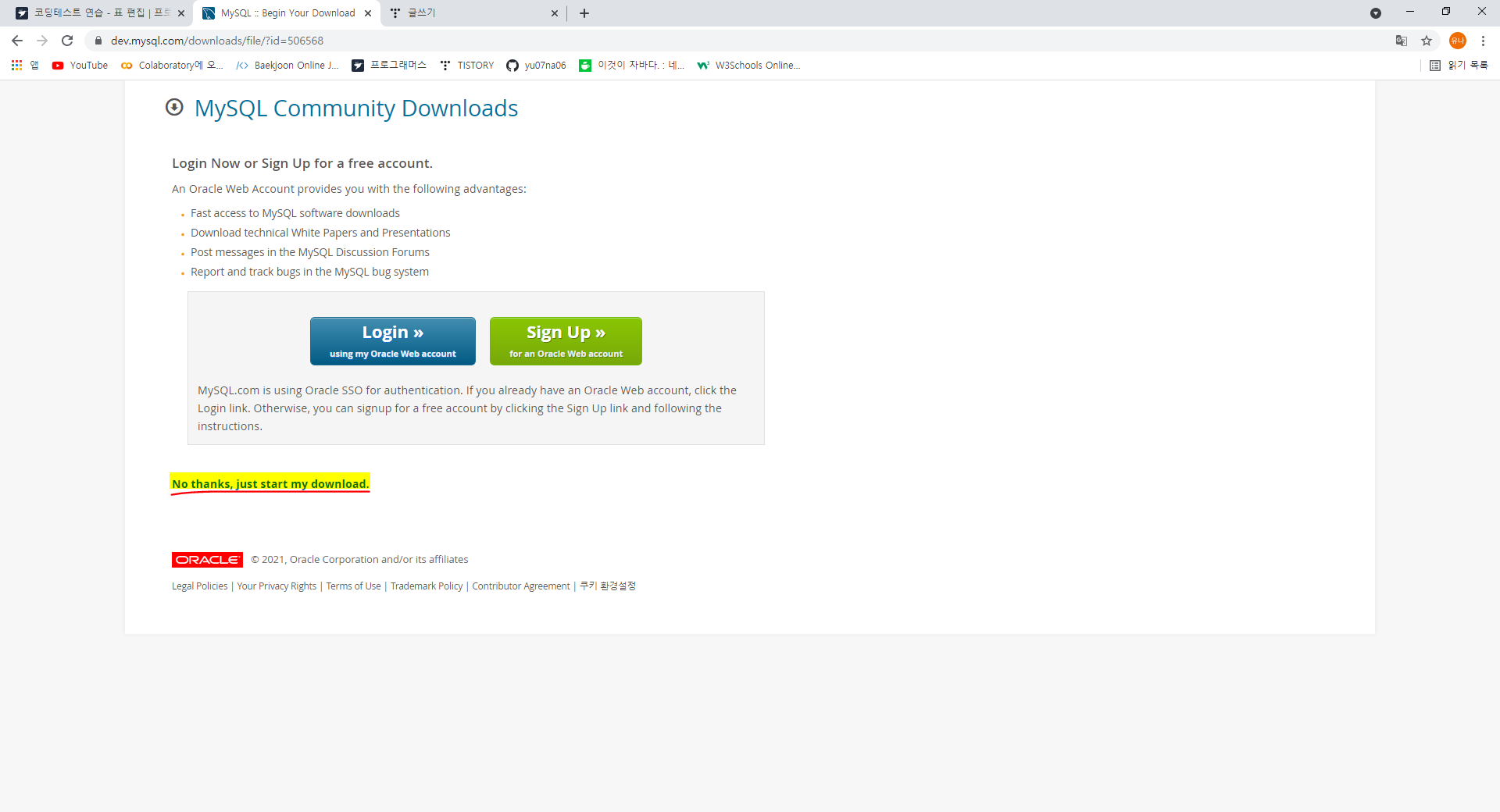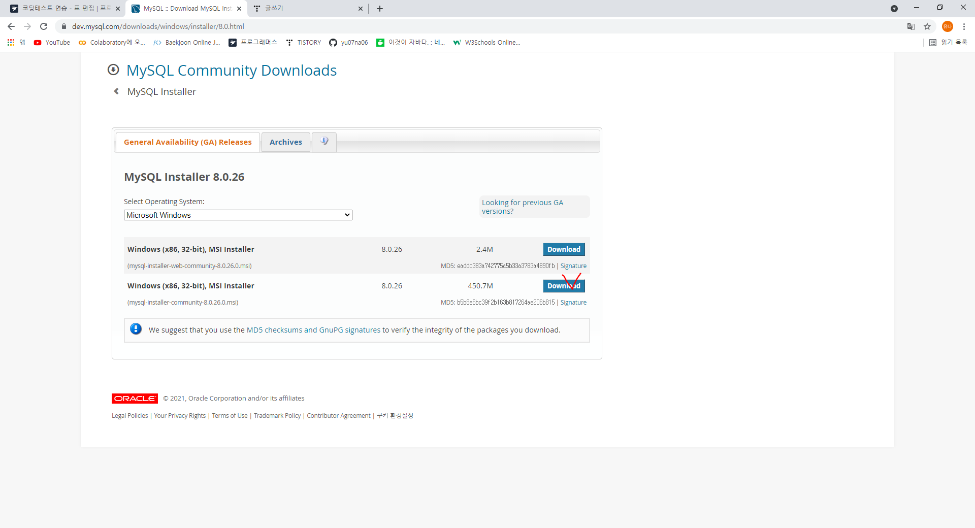 홈페이지에서 DOWNLOADS를 클릭한다.밑으로 내려와 MySQL Community (GPL) Downloads 를 클릭한다.MySQL Community Server 를 클릭한다.그림 아래에 Go to Download Page를 클릭한다.두번째 Download를 클릭한다.No thanks, just start my download를 클릭한다.Next 클릭(변경없이)Next 클릭(변경없이)팝업창이 뜨면, Yes 클릭Execute 클릭Next 클릭Next 클릭포트 번호만 눈도장찍고, Next 클릭Next 클릭(비번 까먹으면, DB 못씀..나는 비번 1234로) 비번 설정 후, Next 클릭 Next 클릭Execute 클릭Finish 클릭Next 클릭Finish 클릭Next 클릭비번 적고 Check 클릭하면, 초록색 창이 뜬다. 그런다음 Next 클릭Finish 클릭뜨는 창을 X 버튼을 누르고, 캡쳐하지 못했지만 콘솔창에는 \quit를 적고 엔터를 쳐서 콘솔창을 끈다.