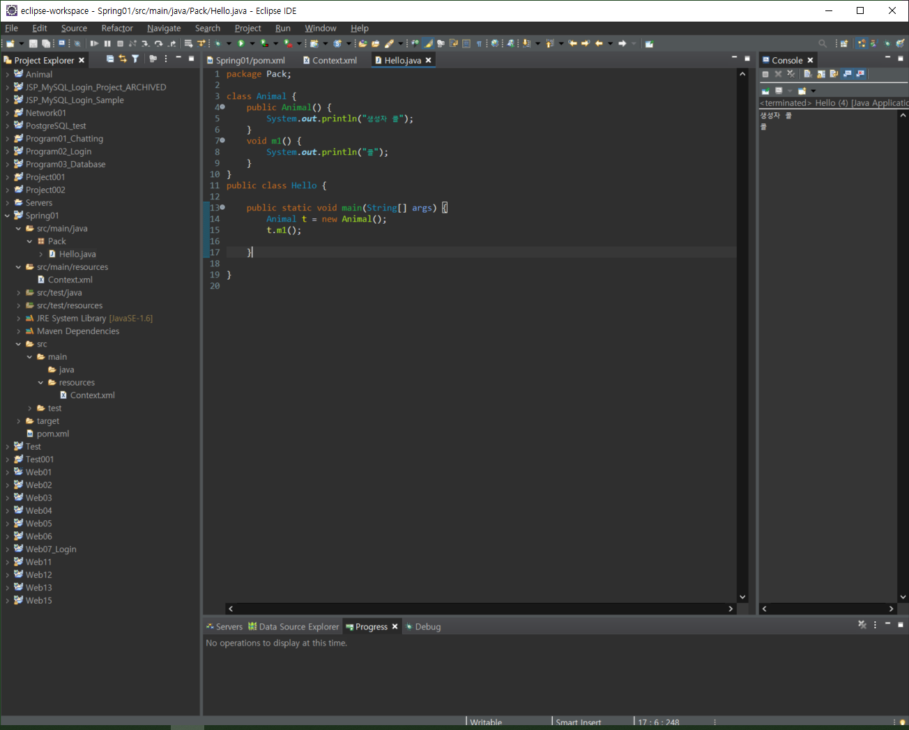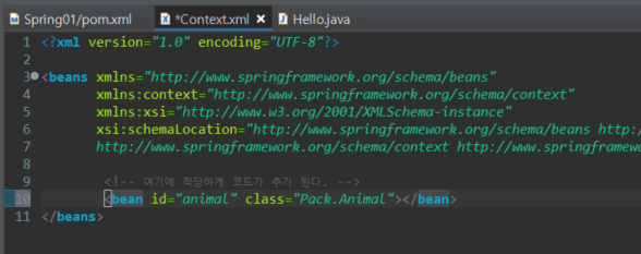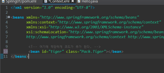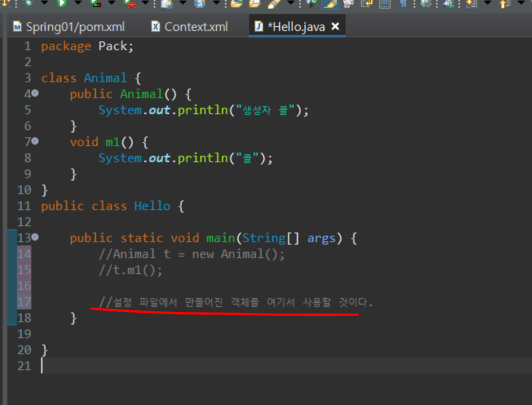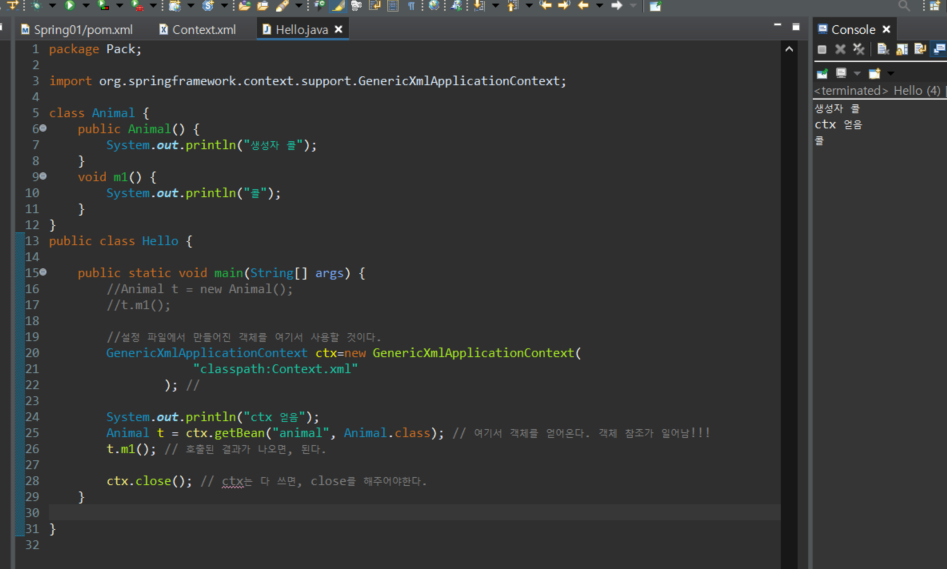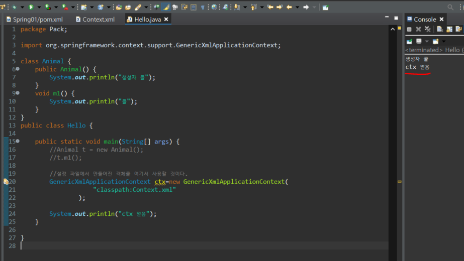 이제 context.xml에서 bean 태그를 사용하여 class를 불러온ㄷ.다시 자바 파일로와서 bean으로 선언된 context.xml을 활용하기도 한다.ctx 객체를 만든다.다음과 같이 classpath를 지정해준다.ctx가 잘 되는지 확인 과정을 거친다.가져온 ctx를 이용하여 메소드를 실행시킨 후, 작동이 잘 되는 것을 확인한다.
