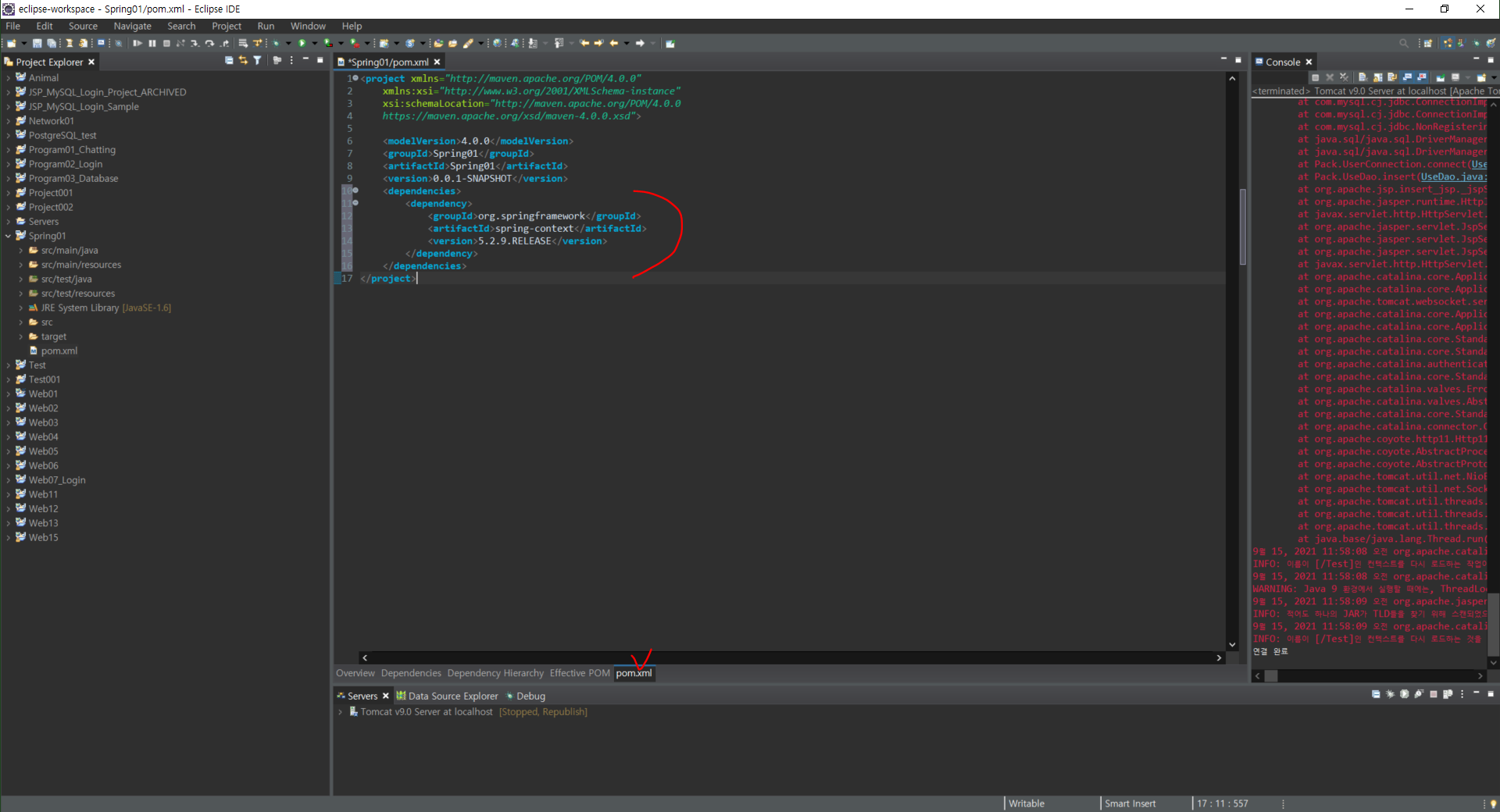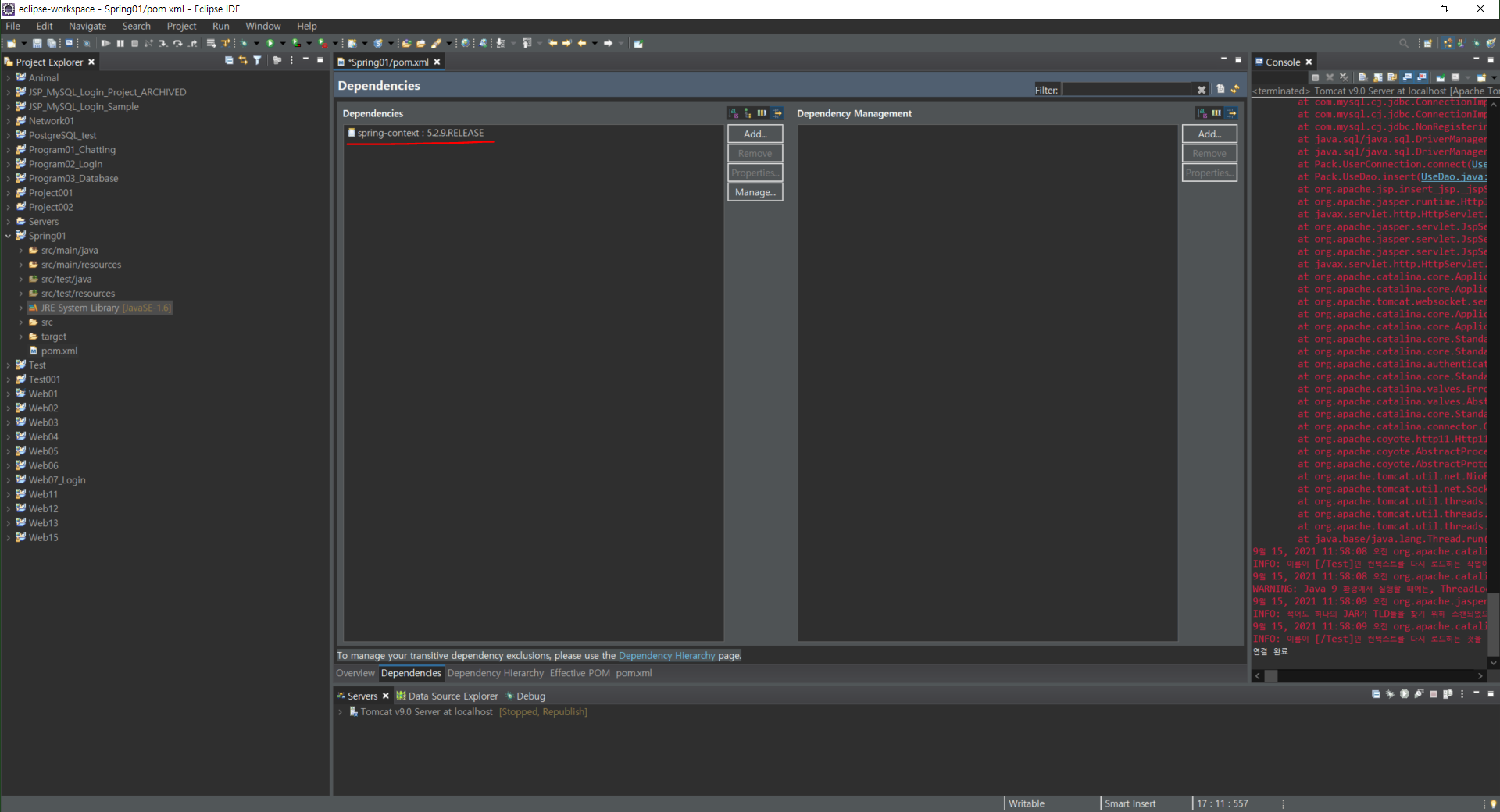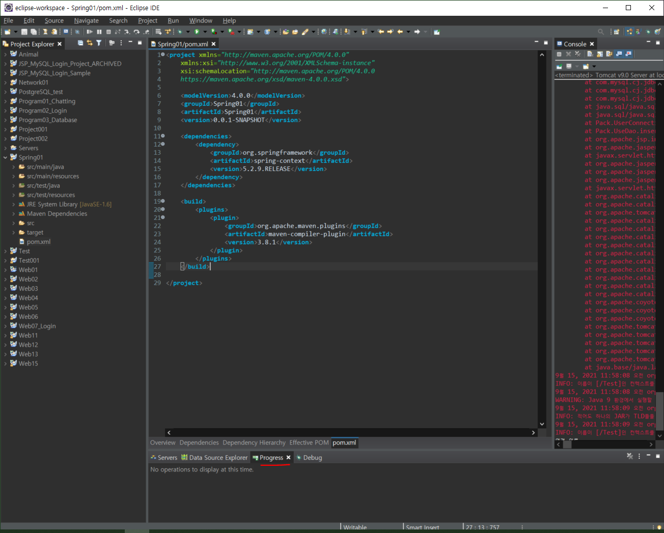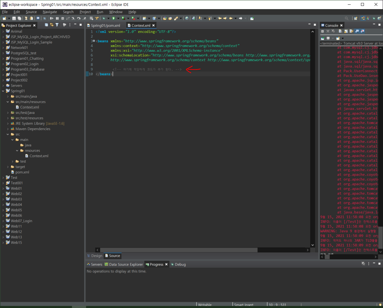 어쨌든 다음과 같이 아까 확인한 버전을 추가해서 넣어준다. 참고로 Window > Show VIew > Progress 를 클릭하면, Alt+F5를 눌렀을때 Update 진행 상황을 수시로 알려준다. 참고!src > main > resource 에서 우클릭한 후, NEw > Other로 들어간다.Context 작성 후, Finish 클릭다음과 같이 생성되었다.만들어놓은 context.xml에 다음과 같은 코드를 넣는다.