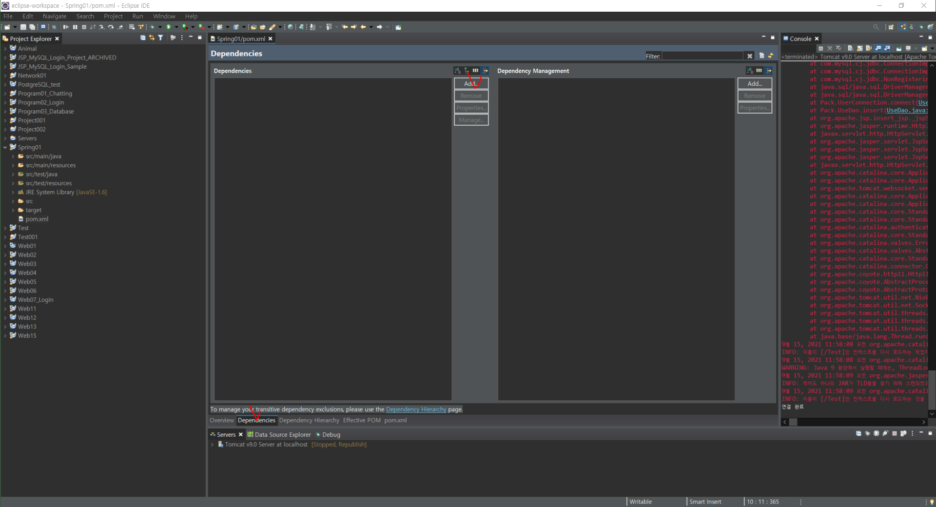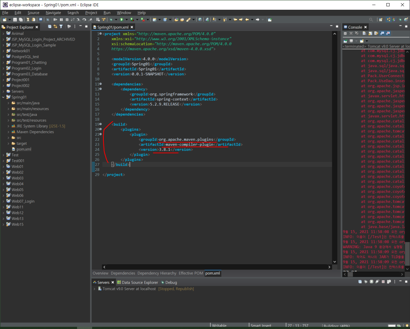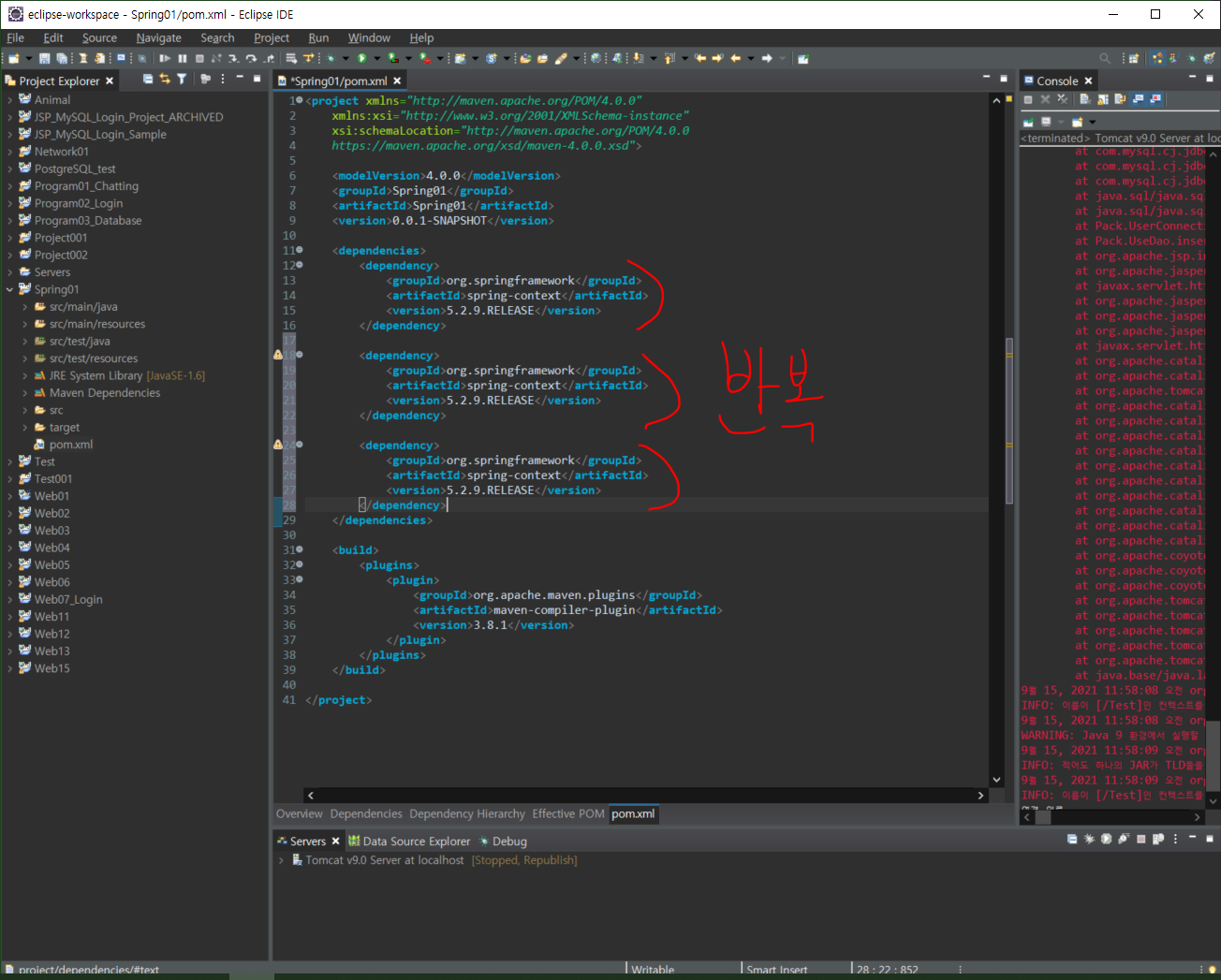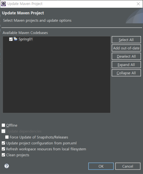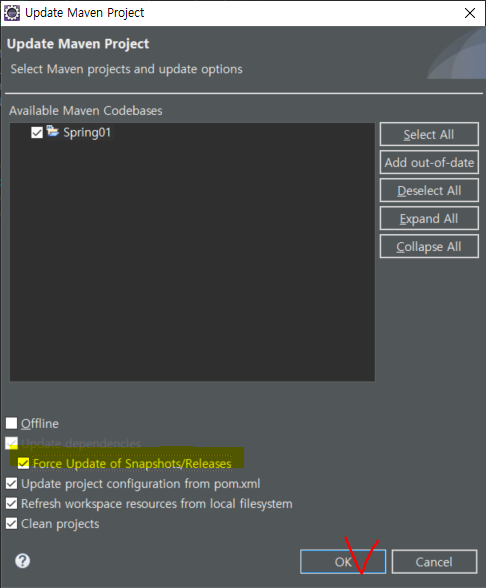 다음과 같이 라이브러리를 들고 온 것을 확인할 수 있다.아래에 pom.xml 탭을 클릭하면, 다음과 같이 dependencies 태그와 함께 라이브러리르 등록된 것을 확인할 수 있다.Ctrl+Shift+S 를 눌러 저장 후, Alt+F5를 누르면 다음과 같은 창이 뜬다.Force Update of Snapshnots/Releases 를 체크한 후, OK를 클릭한다. (저장 후, Alt+F5는 수시로 뭔가 편집할때마다 반복적으로 하는 습관을 가지도록 한다. 말하지 않아도 편집하면 알아서 저장하고 업데이트 해라)인터넷 사이트에서 들고온 build 태그를 다음과 같이 넣는다.
