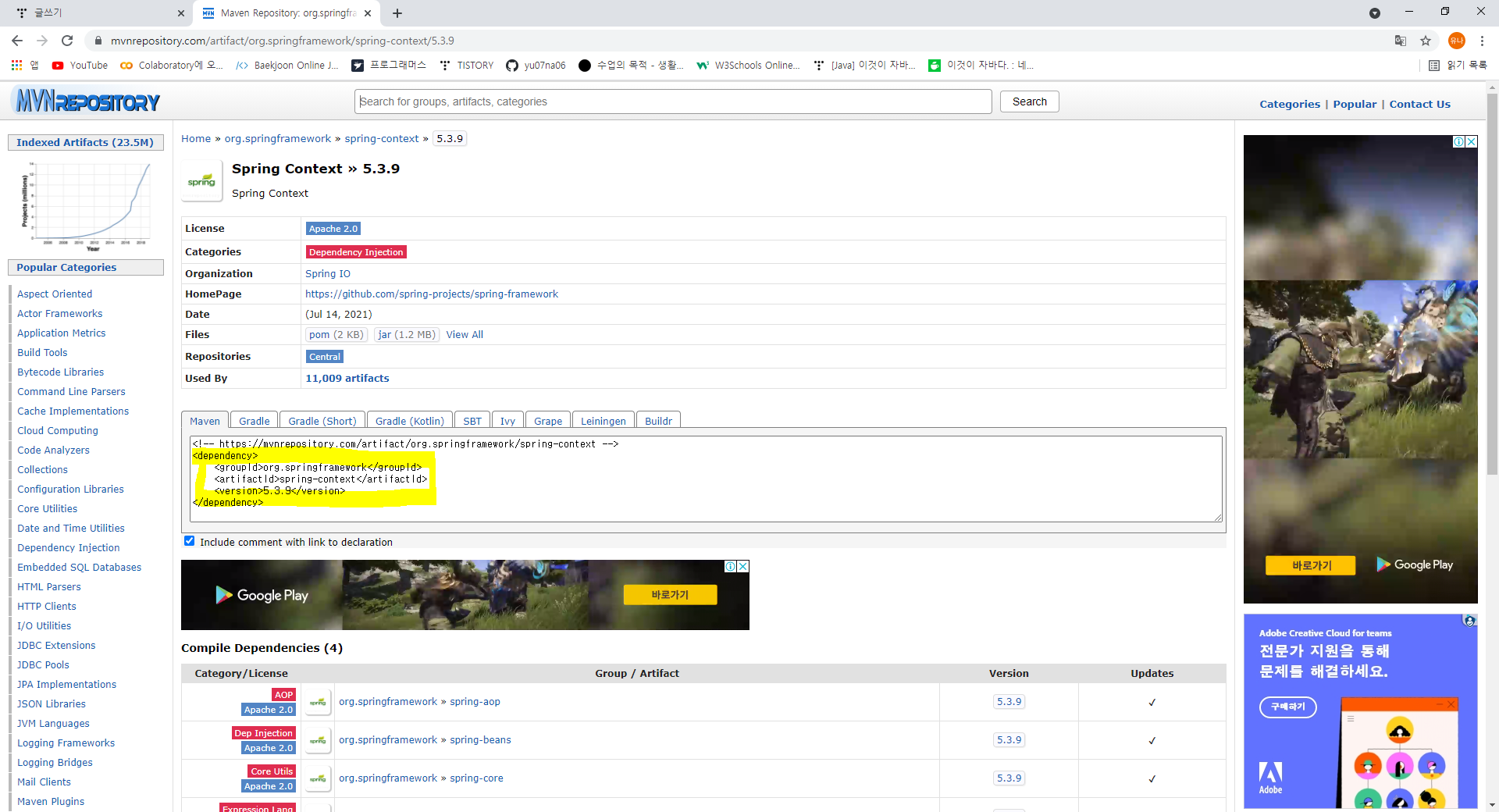 : 아래의 사이트에 들어가 다운받은 라이브러리의 Group id와 Artifact id 그리고 version을 확인한 후, 사용한다.