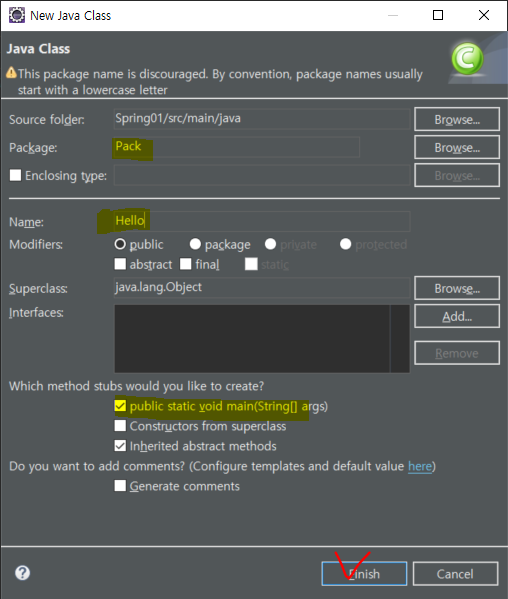 이제 메인 클래스를 만들꺼다. 프로젝트 이름 위에서 우클릭 후, New > Class 를 클릭한다.Package와 Name을 작성한 후, public static void main을 체크한 뒤 Finish를 클릭한다.다음과 같이 코드를 작성한 후, 실행을 시켰을때 오른쪽 콘솔창에 자바 클래스가 정상 작동하는 것을 확인할 수 있다.